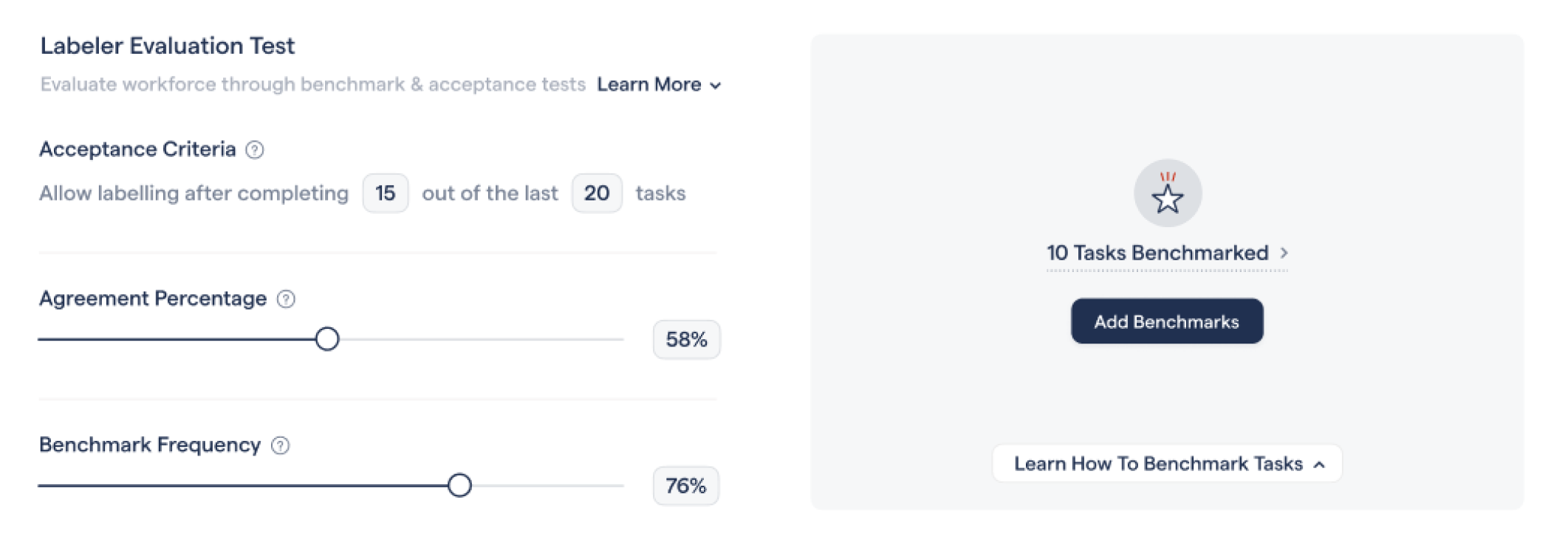 We're introducing a new feature which allows the admins to benchmark the groundtruth tasks which would be further used to evaluate the skills of new and existing set of labelers. Once a minimum number of tasks are benchmarked from the settings page, the newly joined labelers will pass through an acceptance test comprising of the benchmarked tasks. The labelling accuracy when compared to the benchmarks will then result in the labeler getting accepted or rejected.